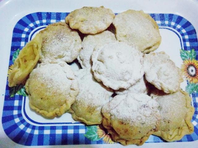 Meanwhile I made the filling recipe. I chopped the apples and cooked it with melted butter/margarine until its soft. I add some sugar to make it sweeter and mix everything well until the apples well cooked. Then I wait until the filling cool enough and the juice is thicker. While waiting for the filling to cool down, I made small balls from the flour dough so I can flatten it into circle pie dough. Then I put a little bit of the filling in the middle of the pie dough, seal the edges and fried them into hot cooking oil until golden brown.